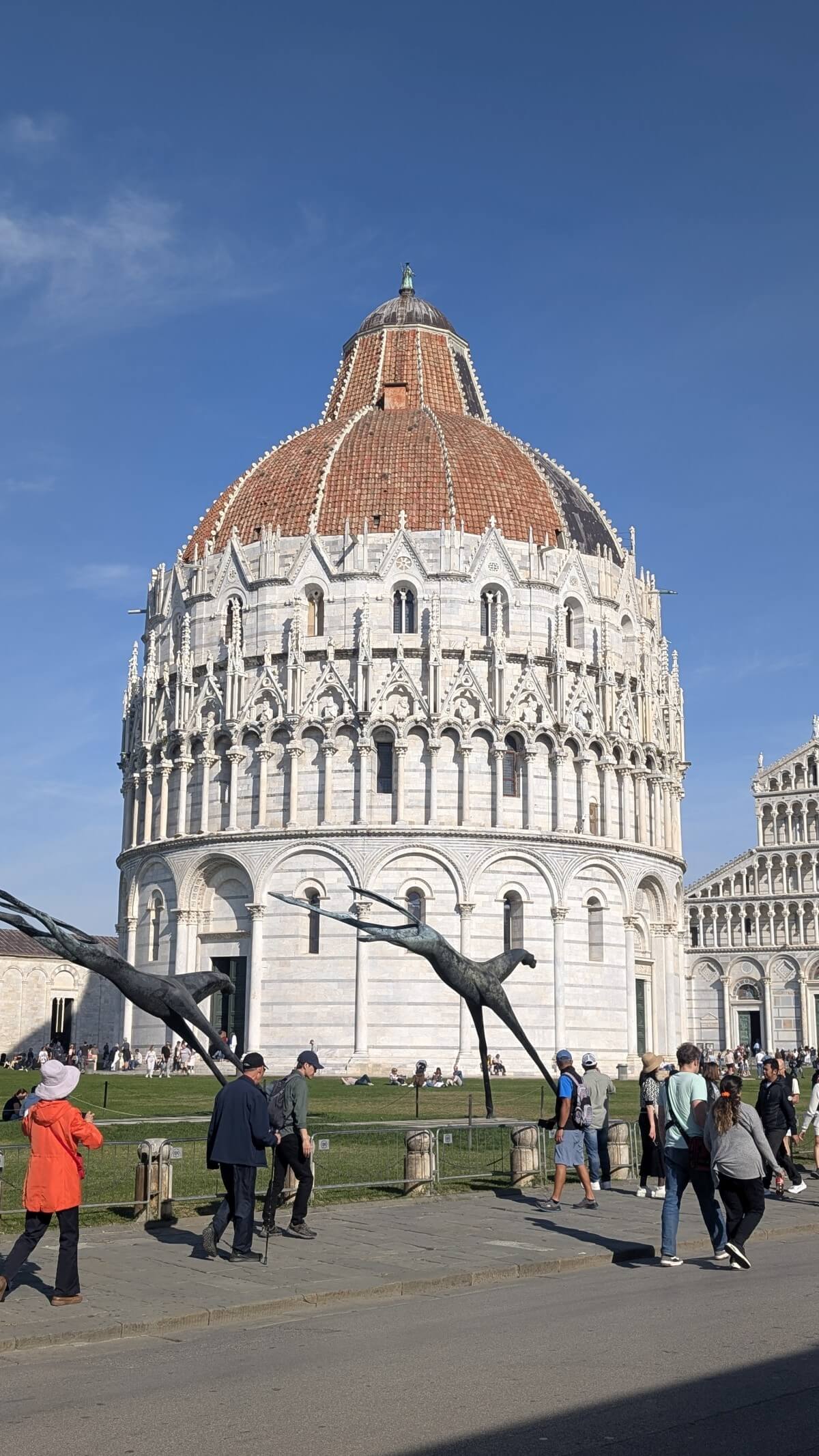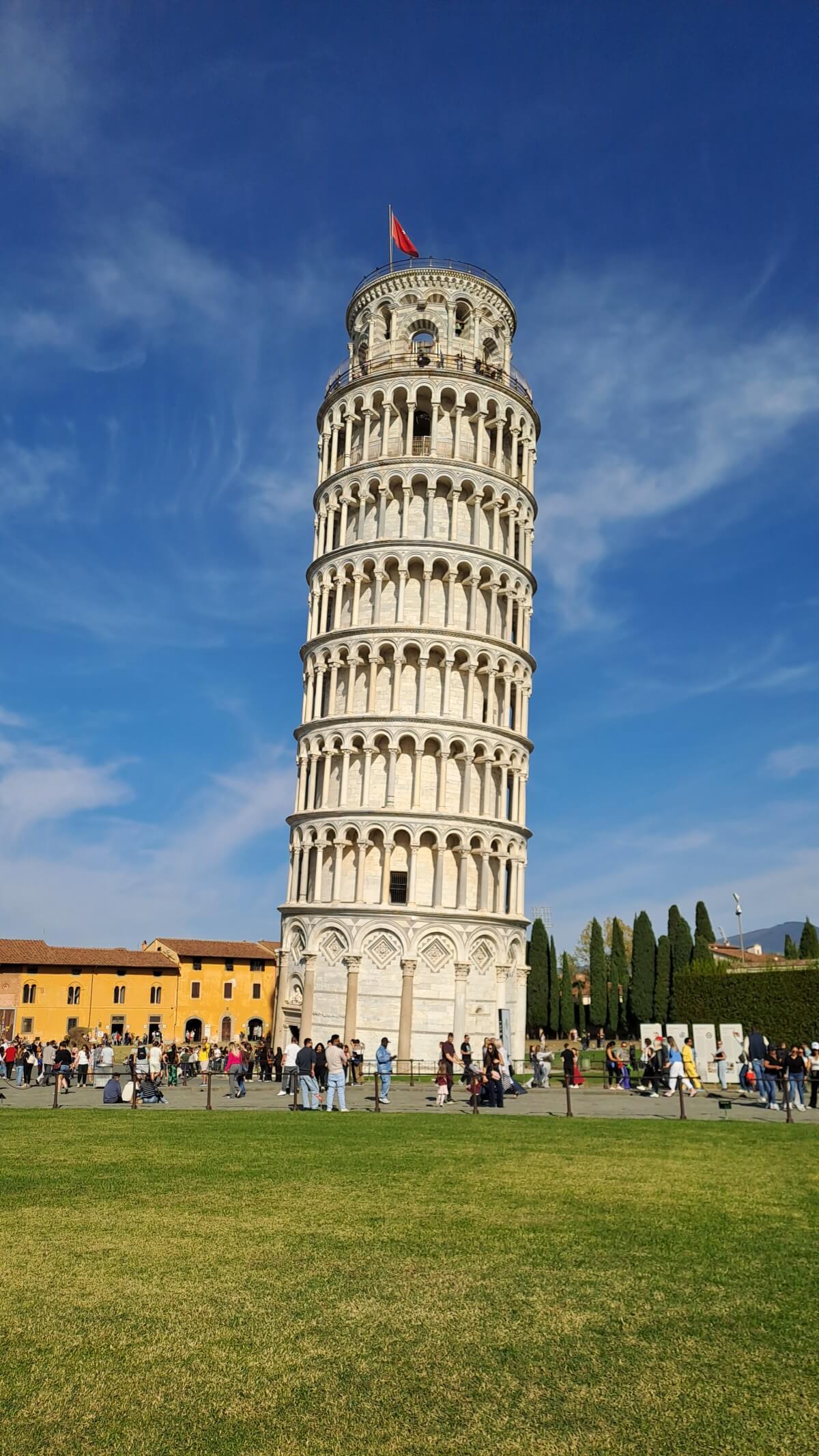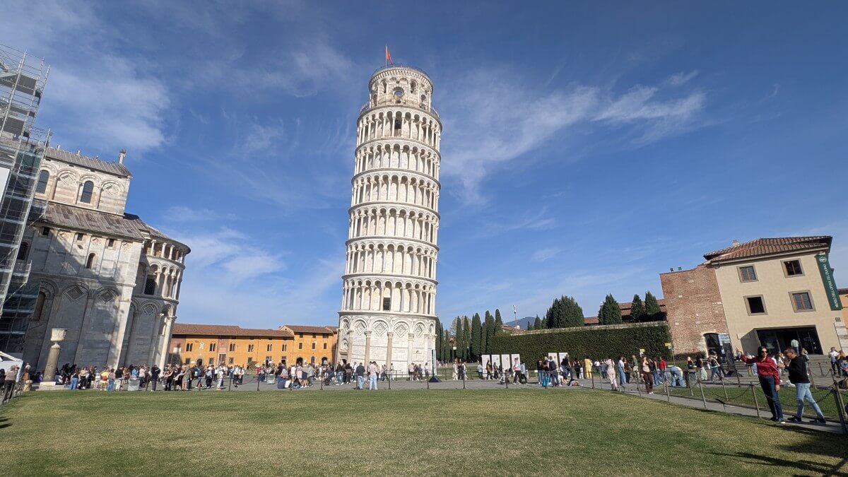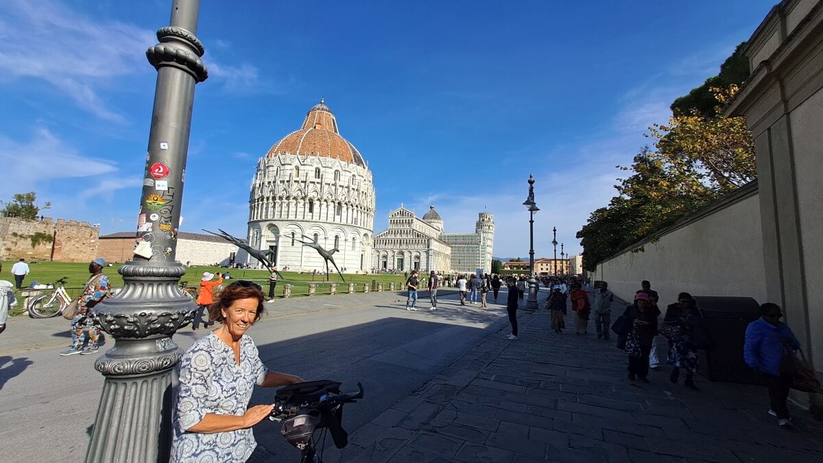 Von hier aus ist es gar nicht mehr weit bis Pisa. Die drei beindruckensten Bauwerke von Pisa finden wir direkt an der Porta Nuova, durch die wir den Domplatz betreten. Ganz aus weißem Carrara Marmor erstrahlt der Schiefe Turm, das Baptisterium und der Dom. Dieses Ensambel ist einfach immer wieder ein wundervoller Anblick.