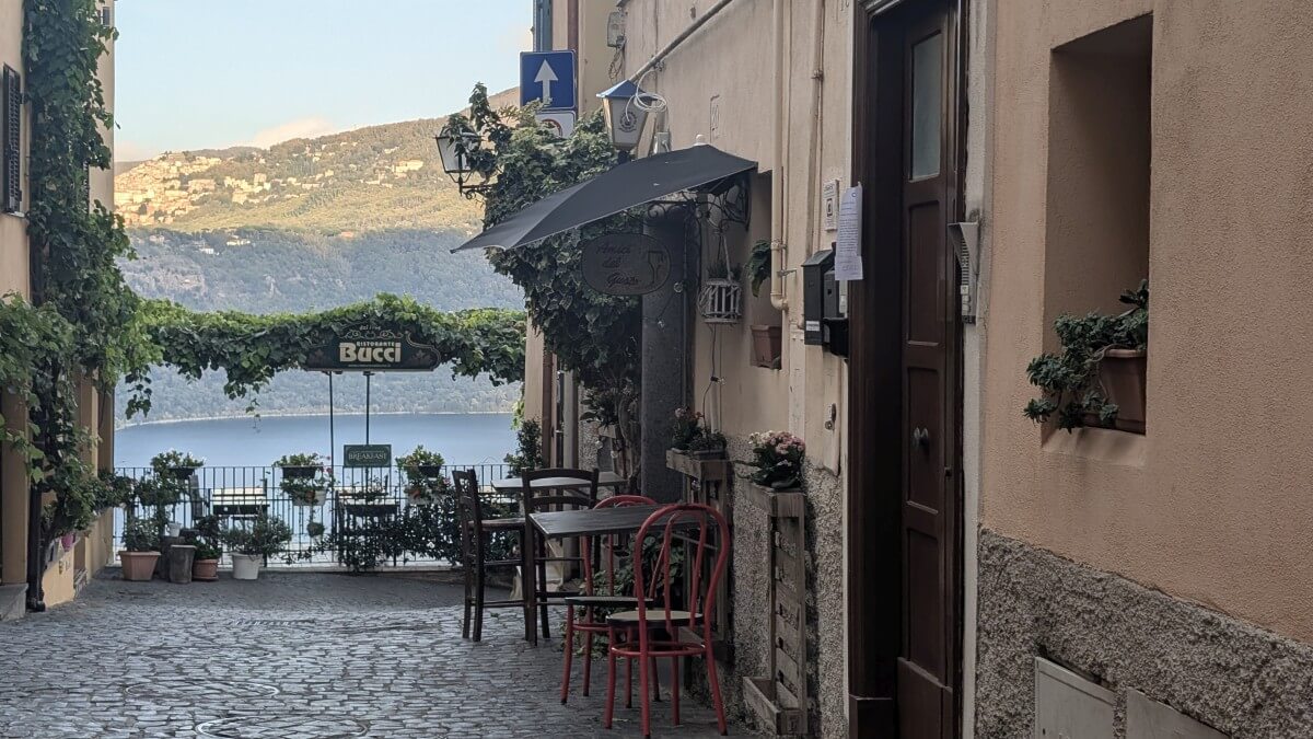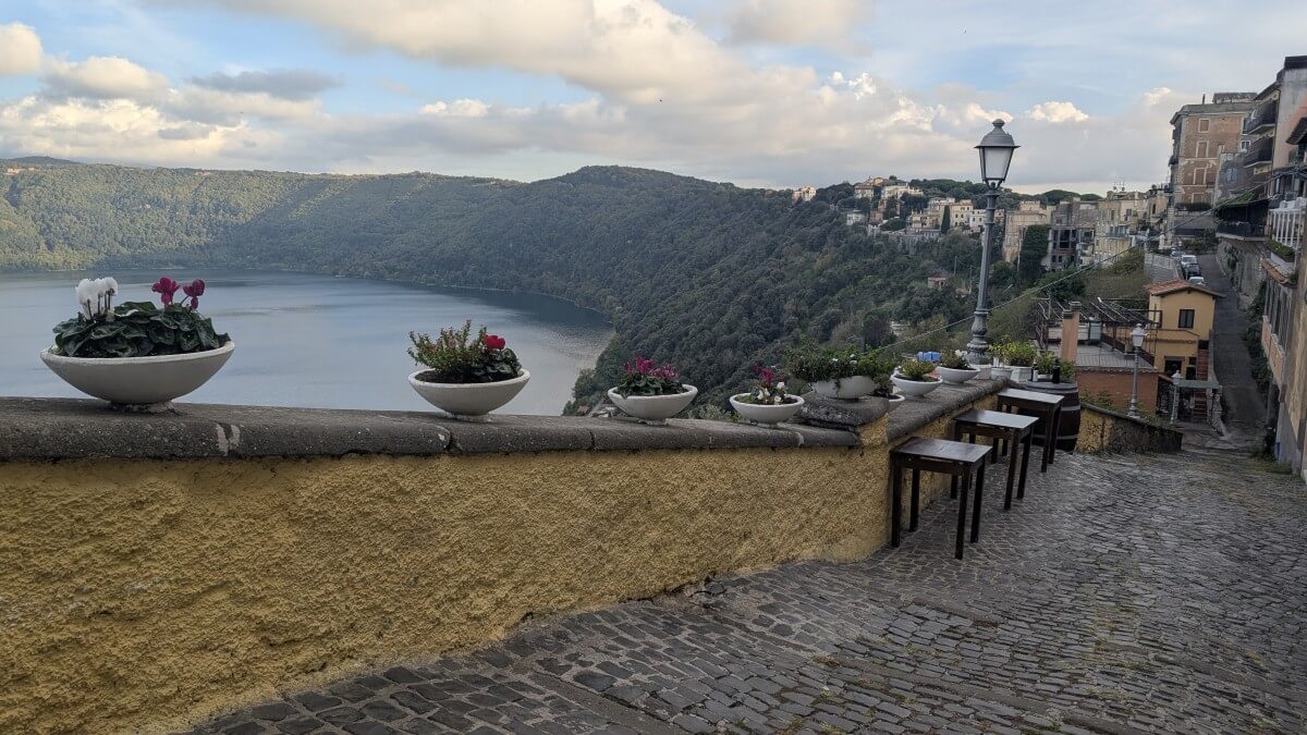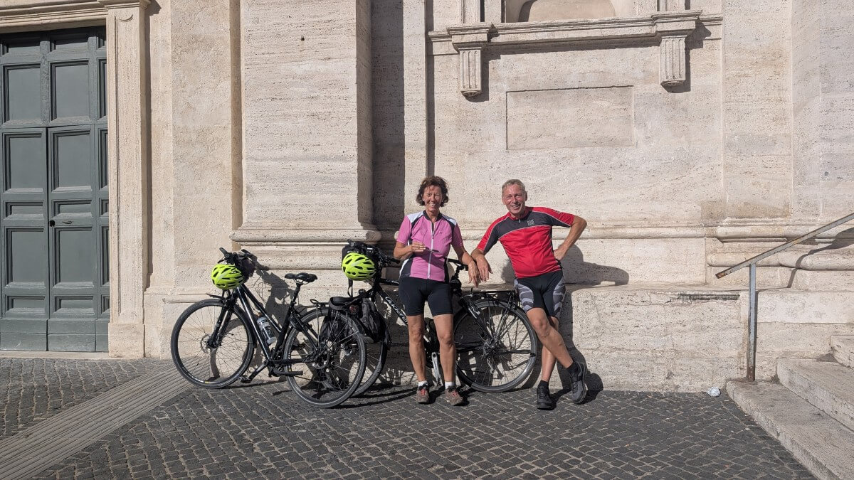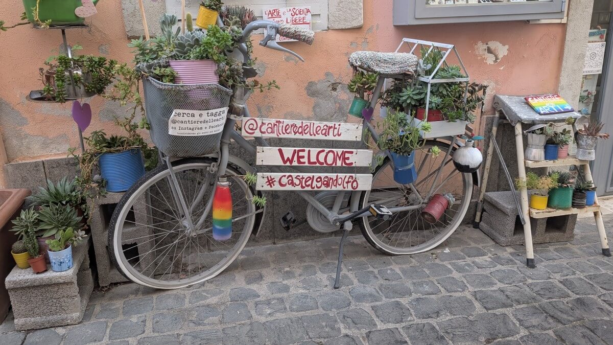 In Ciampino, einem Vorort von Rom, finden wir einen privaten Stellplatz im Garten einer römischen Familie. Wir liegen zwar in der Einflugschneise des Flughafens Ciampino, dafür stehen wir aber sicher und sind in gut 30 Minuten mit dem Zug in Rom am Hauptbahnhof Termini. Zuerst aber radeln wir mit den Fahrrädern zur Sommerresidenz des Papstes nach Castel Gandolfo. Es sind nur ca 7 km von unserem Standort. Die aber haben es in sich, denn Castel Gandolfo liegt schon in den Albaner Bergen mit direktem Blick auf den See.
