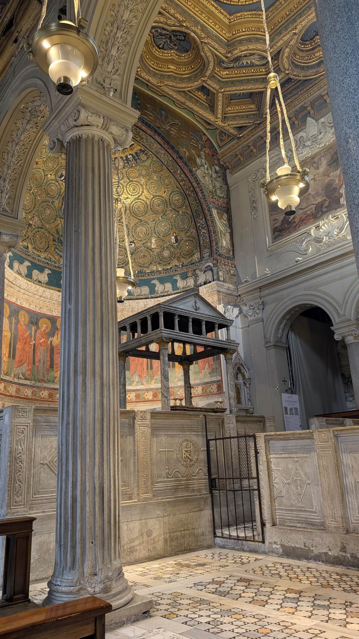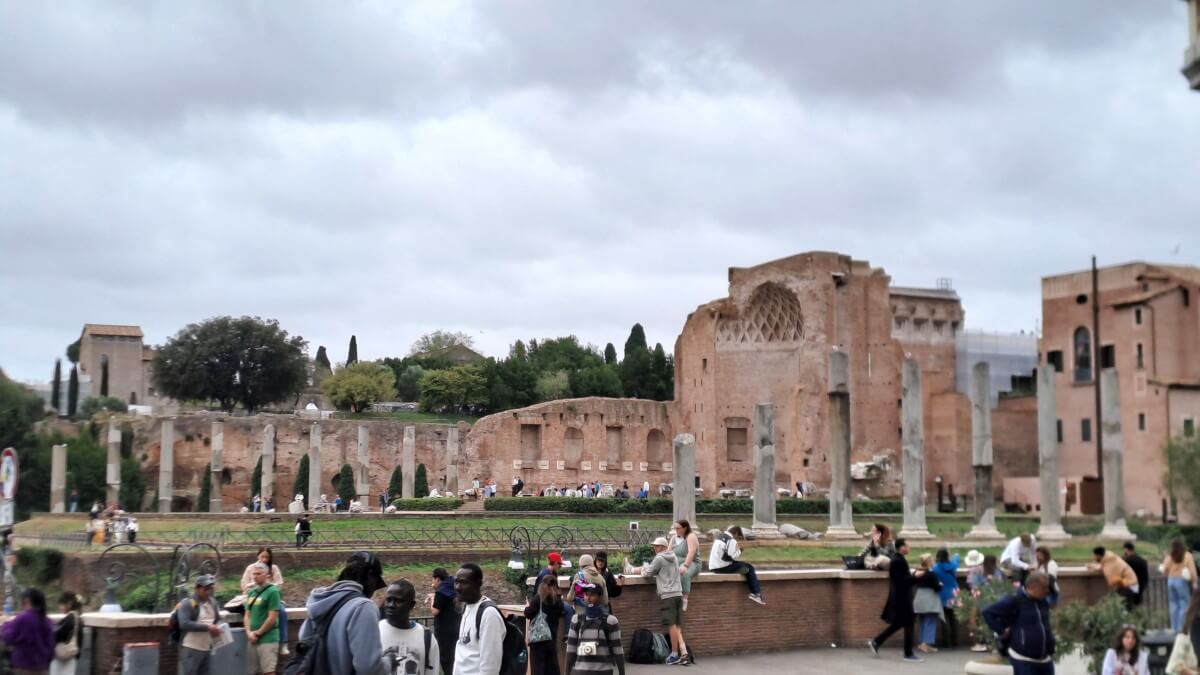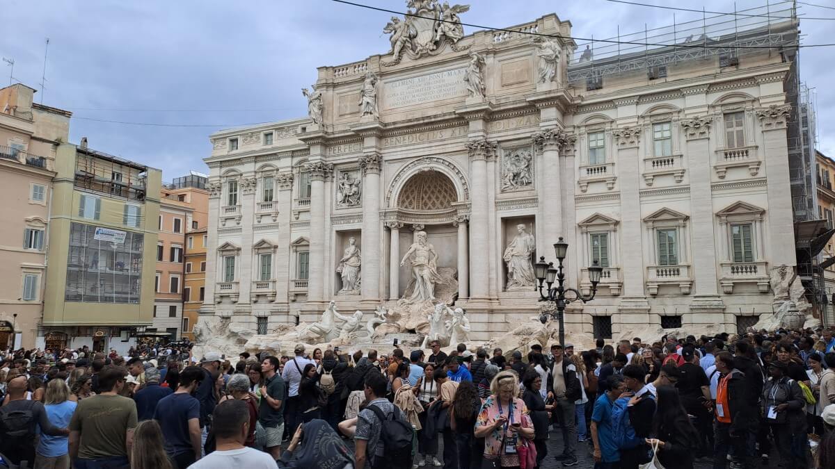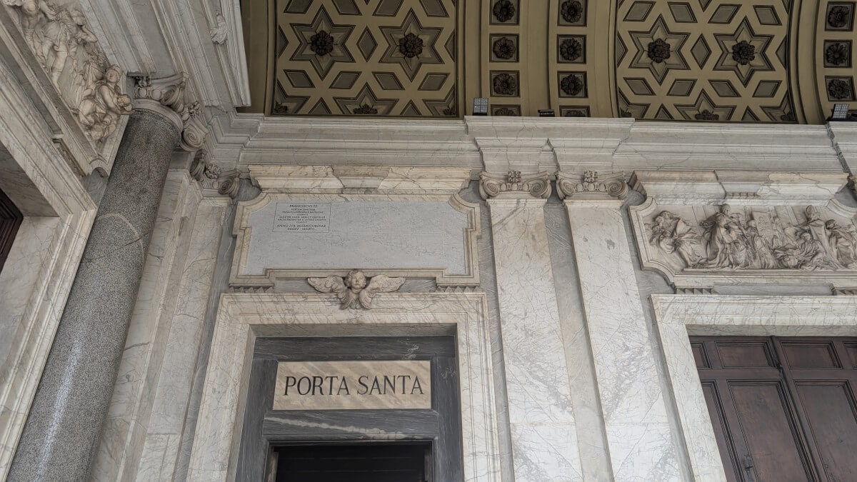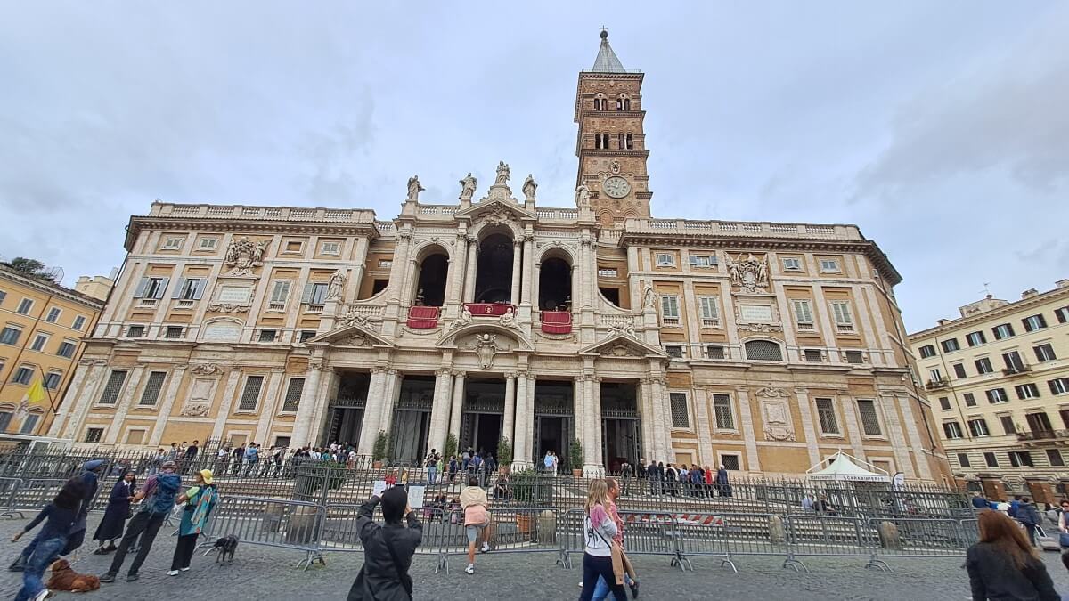 In Rom selbst besuchen wir zunächst eine der fünf päpstlichen Basiliken „Santa Maria Maggiore“. Auch hier ist in diesem „Heiligen Jahr 2025“ die heilige Pforte „Pota Santa“ geöffnet. Beim Hindurchschreiten sollen den Gläubigen alle Sünden erlassen werden. Es herrscht ein riesiger Andrag hier mit langen Warteschlangen, was vielleicht auch daran liegen mag, dass in dieser Basilika Papst Franziskus bergraben liegt. Seine Beisetzung ist gerade mal ein halbes Jahr her und so wundert es nicht, dass so viele Menschen hierher pilgern. Auch wir gehören schließlich dazu und bewundern die Schönheit der Kirche.