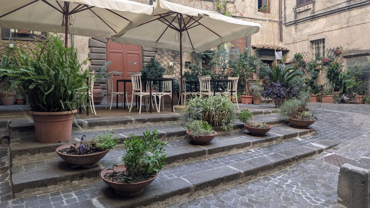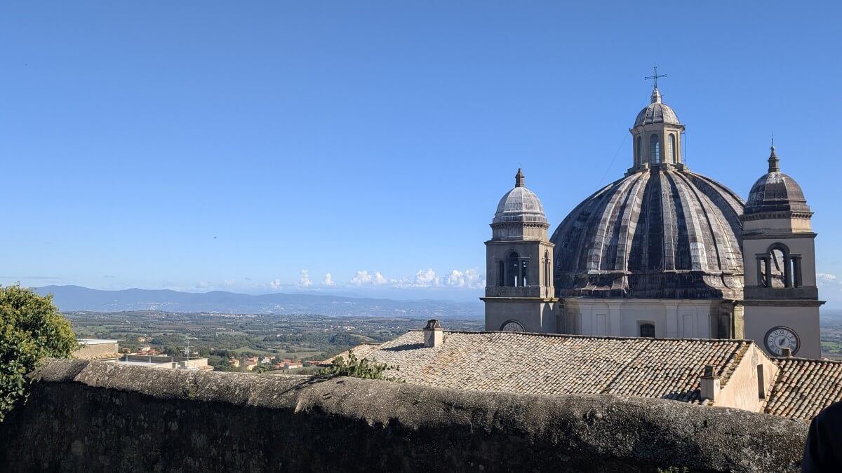 Mit Montefiascone erleben wir wieder eine ganz normal belebte Stadt, allerdings mit wundervoller Aussicht oben vom „Rocca dei Papi“ einer alten Festungsanlage. Der Panoramablick hat es in sich. Wir erblicken auf der einen Seite die Kuppel der Basilika San Flaviano, die wir zuvor schon besichtigt haben und auf der anderen Seite den Lago di Bolsena, zu dem wir uns im Anschluss aufmachen werden.