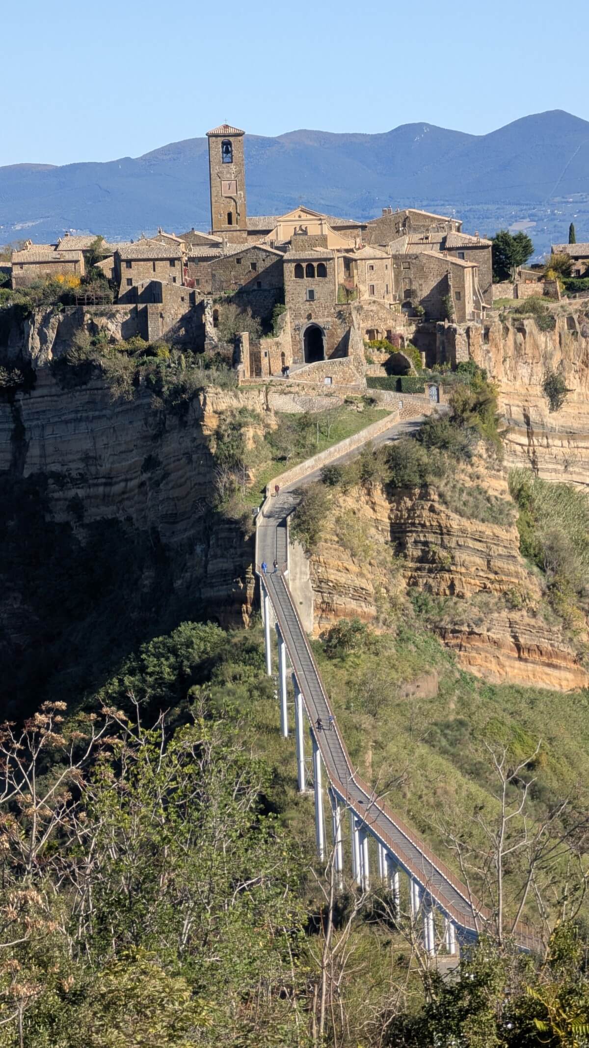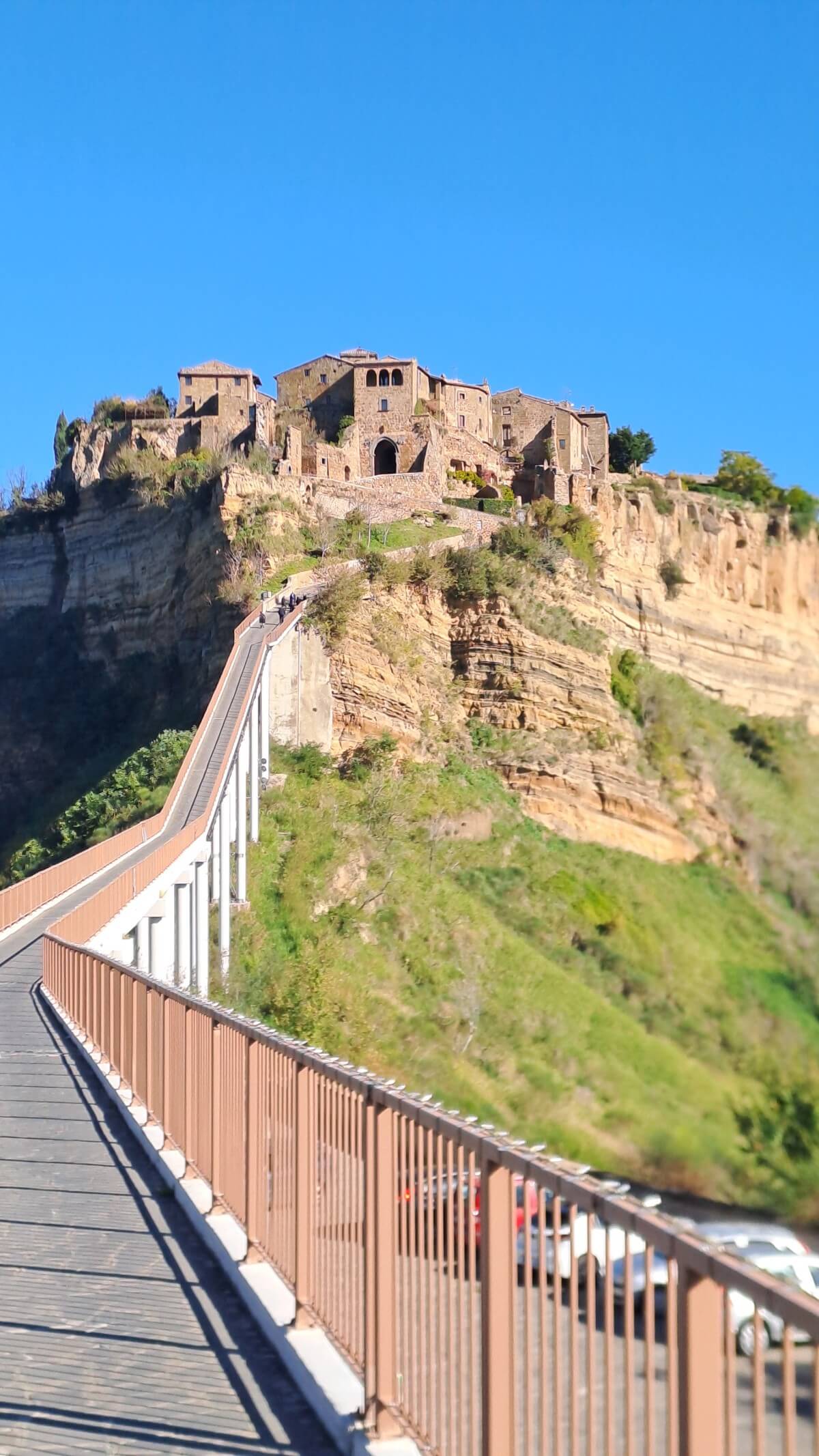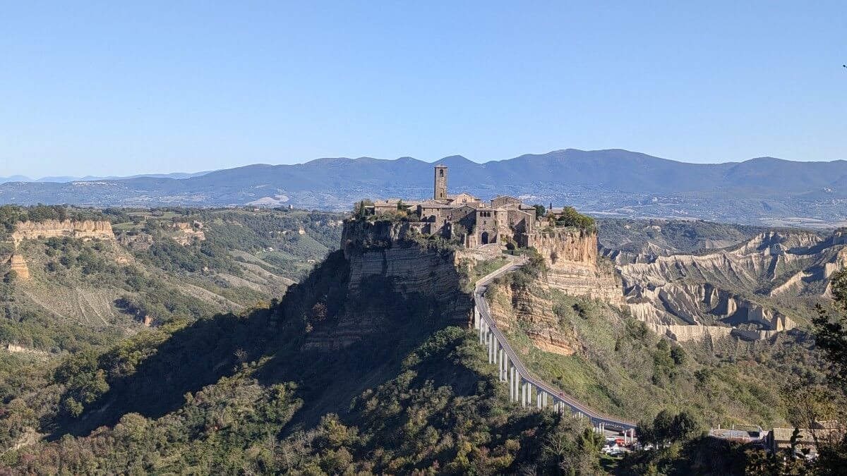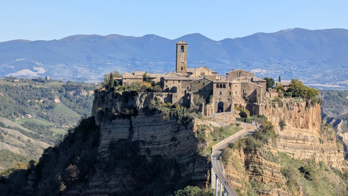 Civita di Bagnoregio, häufig in Reiseführern auch die „sterbende Stadt“ genannt, steht auf einem Tuffsteinfelsen, der nur über eine 300 Meter lange Fußgängerbrücke erreichbar ist. Für 5€ pro Person darf man diese passieren. Momentan leben keine 20 Menschen mehr in diesem über 2500 Jahre alten Dorf. Schön restaurierte Häuser in den alten Gassen beherbergen Restaurants unterschiedlichster Art ebenso wie einige Souvenierläden.