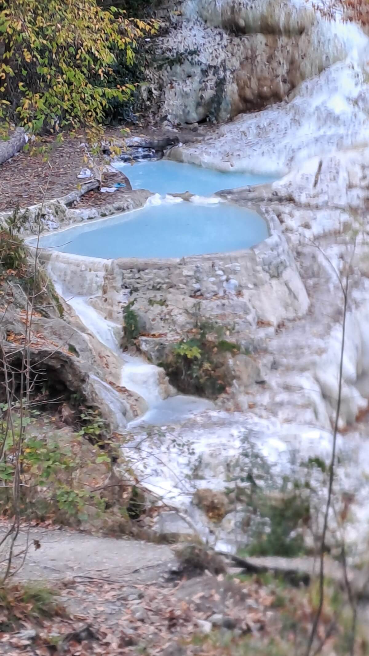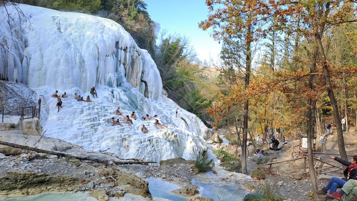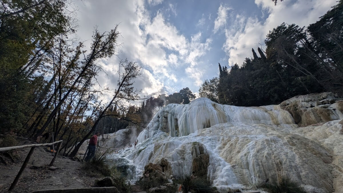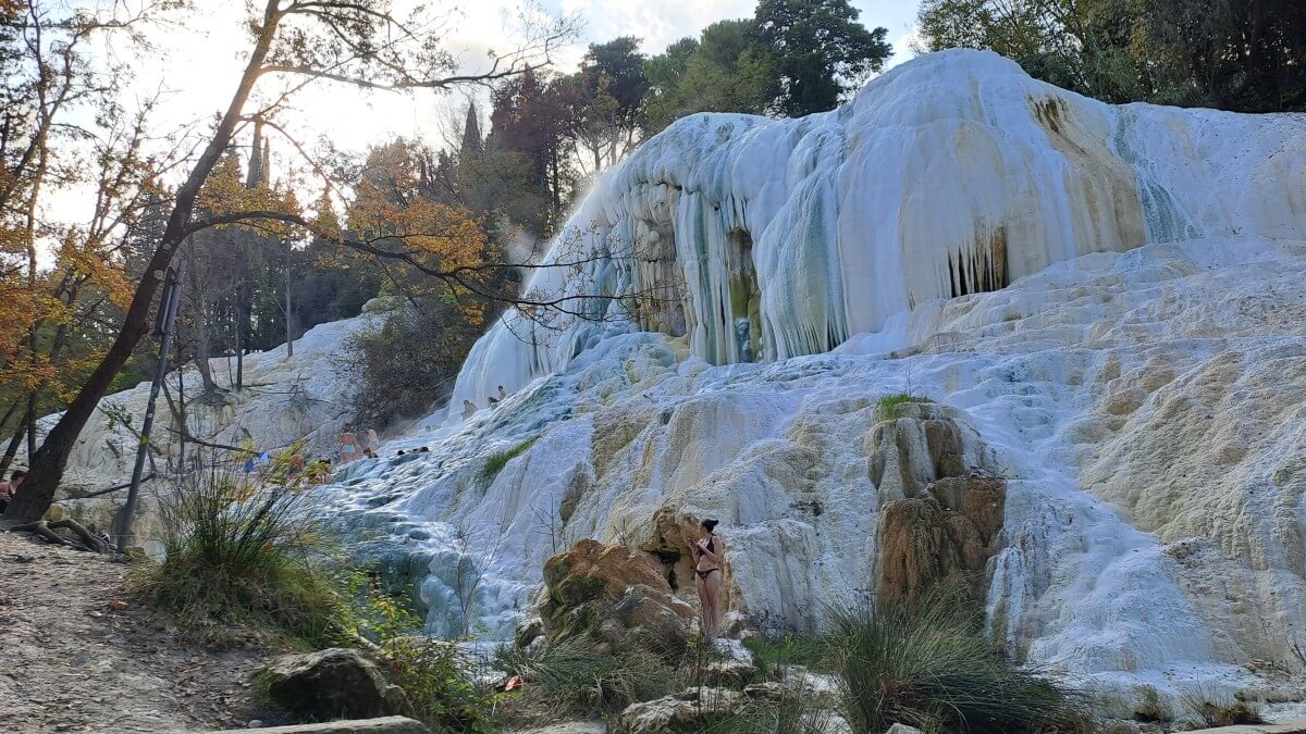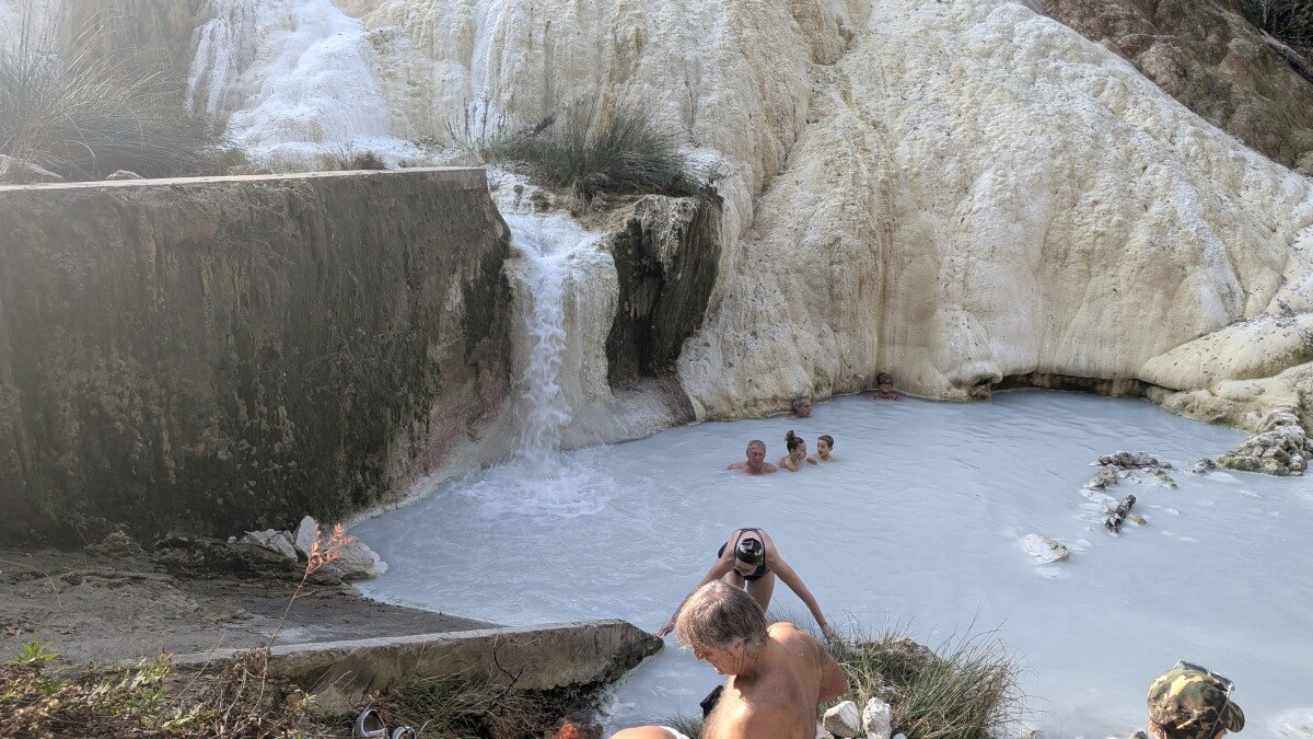 Über den Festungsort Radicofani erreichen wir die Thermalquellen von Bagni San Filippo. Mitten in der freien Natur befinden sich hier die natürlichen Becken unterhalb der beeindruckenden weißen Kalksteinformationen. Mit ca 50°C kommt das schwefelhaltige Wasser aus der Quelle und kühlt sich in den verschiedenen Becken auf angenehme Badetemperaturen ab. Es liegt ein etwas gewöhnungsbedürftiger Geruch in der Luft und dennoch trauen wir uns für ein kurzes Bad ins Wasser. Wohl wissend, dass uns am Abend eine heiße Dusche auf dem Stellplatz an der Olivenmühle in Chianciano erwartet.